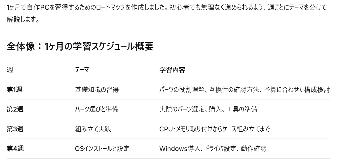 新しいスキルを習得したいとき、「〇〇を1ヶ月で習得するためのロードマップを作って。初心者向けに日本語でステップを分けて解説して」と指示します。