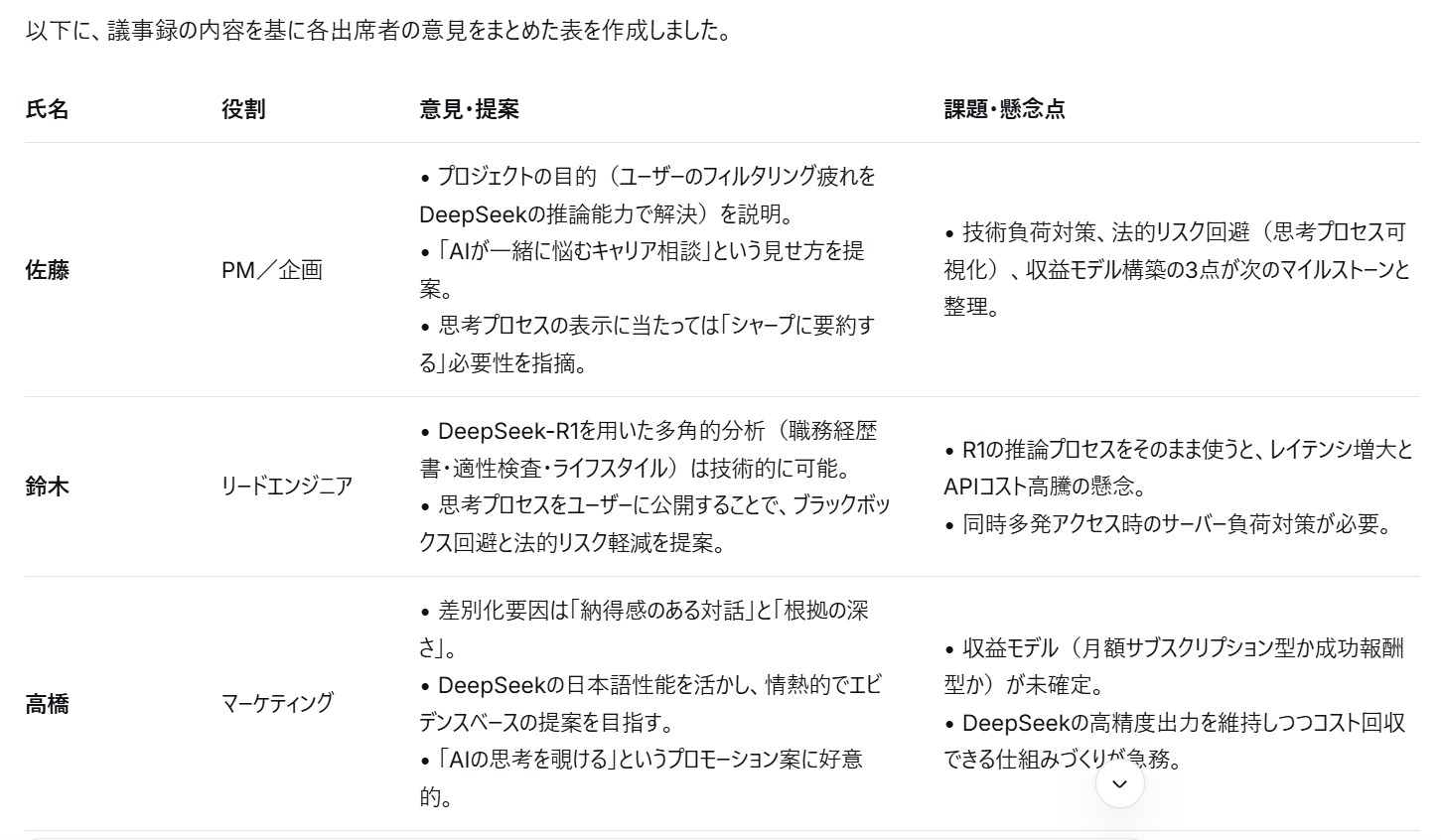 DeepSeekは情報の優先順位をつけるのが得意なため、単なる抜き出しではなく、全体を俯瞰したシャープな要約を作成してくれます。