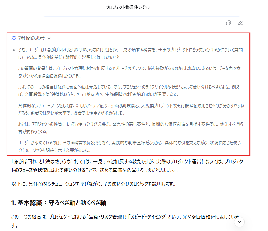 ディープシンクをONにすると、AIがどのように悩み、試行錯誤して答えを導き出したかが表示されるため、