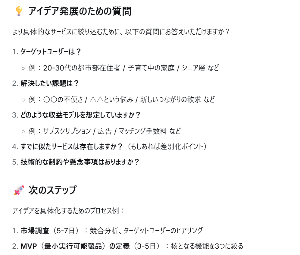 AIが「ターゲットは誰か?」「想定する収益モデルは?」と質問を交えながら共に回答を作り上げていくため、ユーザー自身も気づかなかった盲点や、新しい切り口を見つけるヒントが得られます。