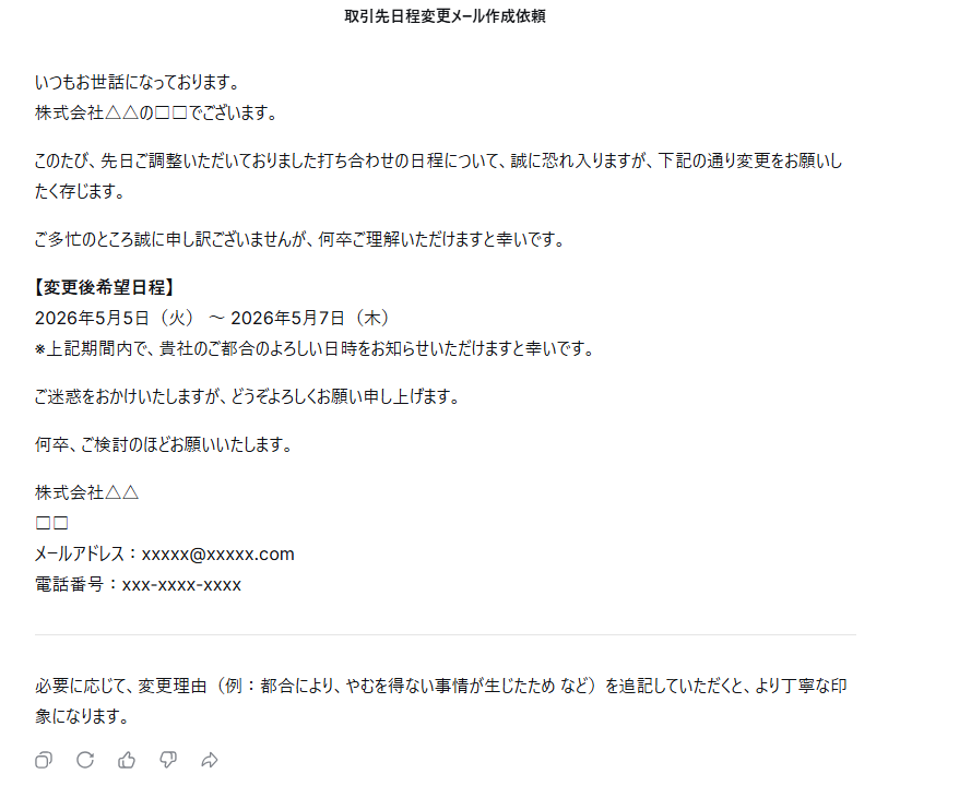 作成された文章に不自然さはなく、非常に丁寧で日本的なビジネスメールに仕上がっています。