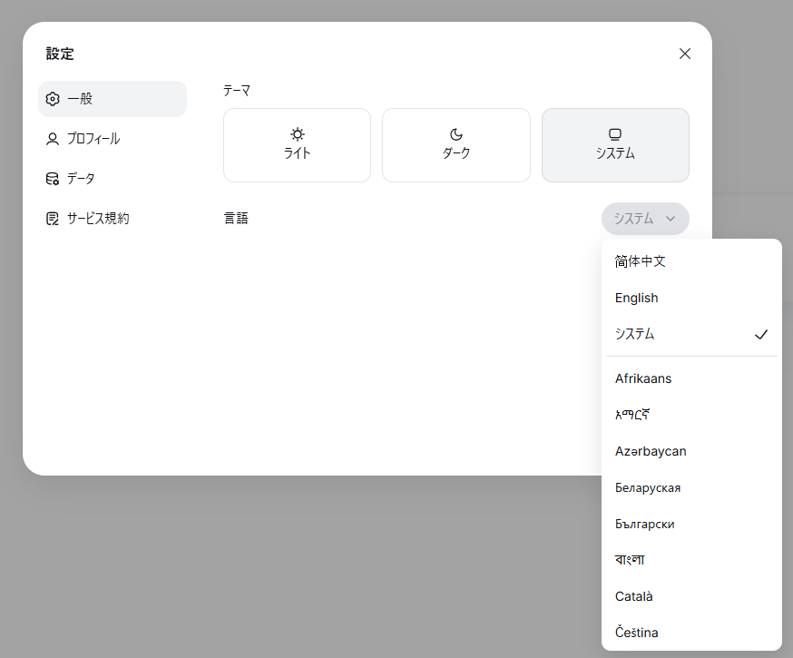 設定画面を確認すると言語の設定は「システム」の表記となっており、ブラウザやデバイスの設定に基づいて、利用者の言語を自動的に切り替える仕組みのようでした。