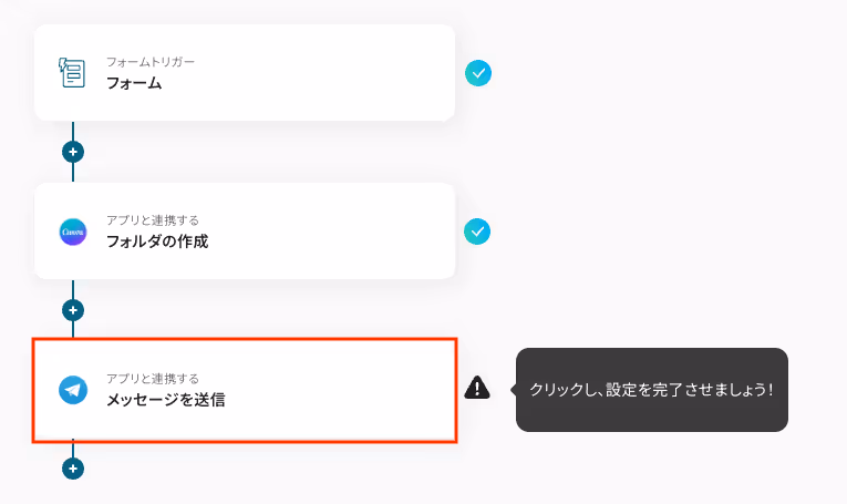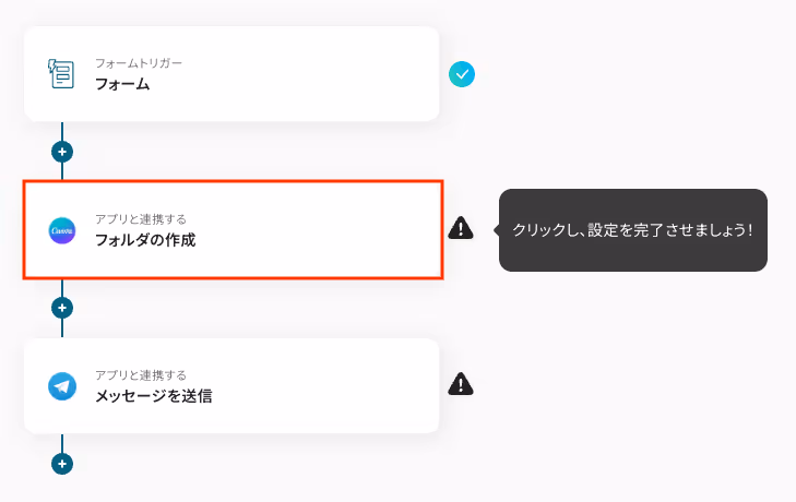 今回は「フォームが送信されたら、Canvaでフォルダを作成しTelegramでメッセージを送信する」フローを作成していきます!作成の流れは大きく分けて以下のとおりです。