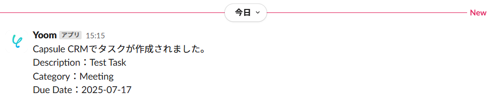 このワークフローを活用すれば、Capsule CRMでタスクが作成されたタイミングをトリガーに、その内容を自動でSlackに通知できます。