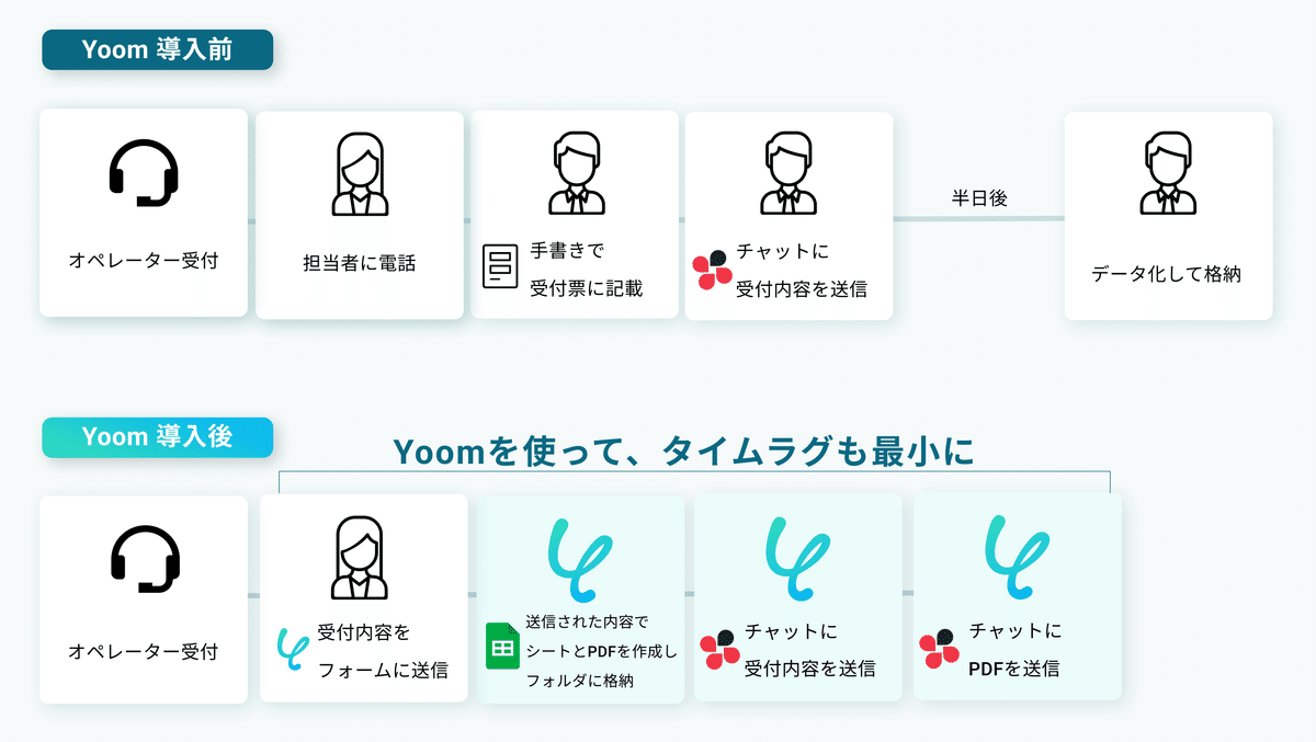 Yoom導入後は、電話を受けた者がお客様のお名前や住所などをフォームに入力するだけ。その情報がスプレッドシートに自動転記され、PDF化されたものがChatworkで共有されると同時にGoogle Driveに格納されます。一度のフォーム入力で、同じ情報をメンバーに即時共有できるようになりました。