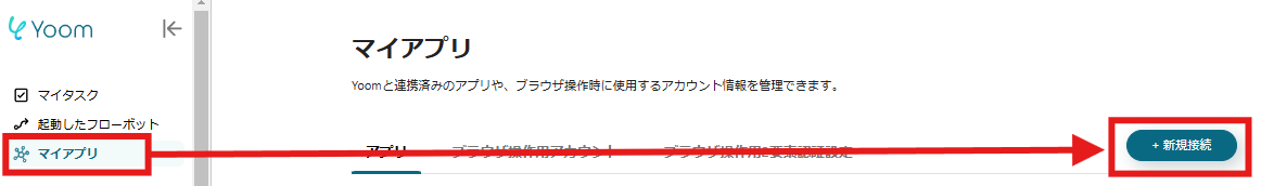 Yoomを開き、画面左側のマイアプリをクリックし、右側の「新規接続」をクリックしましょう。