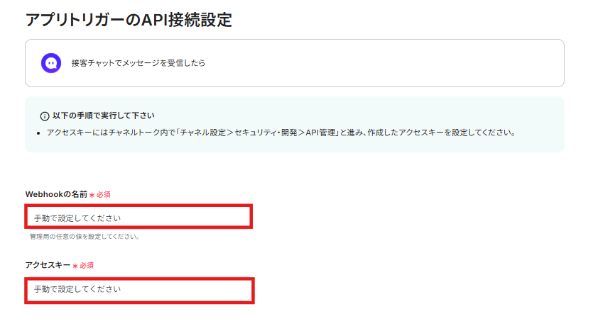 チャネルトークでメッセージを受信したことを自動化のトリガーにするための設定を行います。