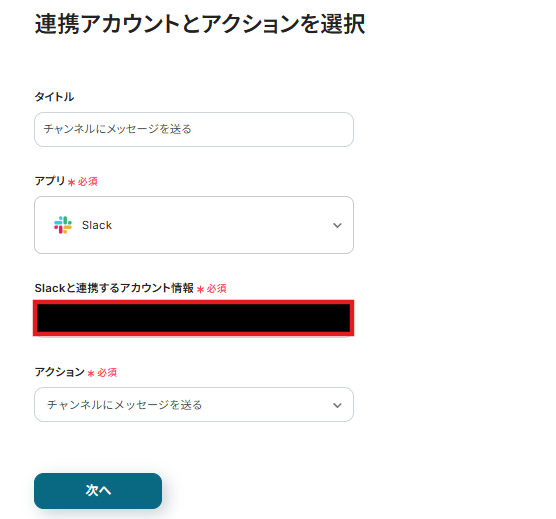 連携アカウントとアクションを選択する画面が表示されるので、今回連携するSlackのアカウントを確認し「次へ」をクリックします。