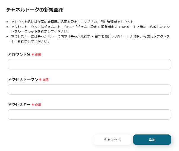 Yoomの管理画面にある「マイアプリ」からチャネルトークを追加し、画面の指示に従ってAPIキーなどを入力するだけで、簡単に接続設定が完了します。