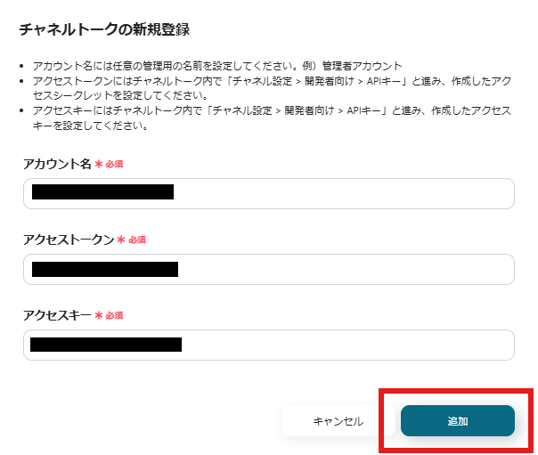 入力が完了したら以下画像の赤枠内の「追加」をクリックします。