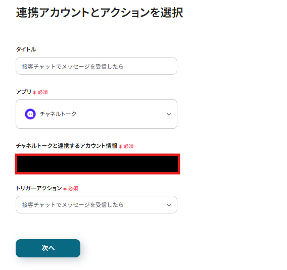 連携アカウントとアクションを選択する画面が表示されるので、今回連携するチャネルトークのアカウントを確認し「次へ」をクリックします。