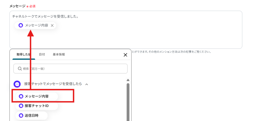 メッセージにはチャネルトークでメッセージを受信した旨と、「取得した値」からメッセージをクリックし入力しましょう。