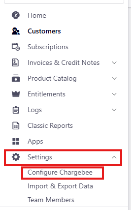Chargebeeの左側のメニューから「Settings」を開き、「Configure Chargebee」を選択してください。