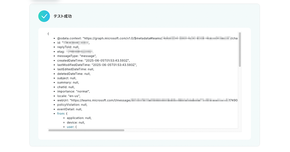 成功すると、メッセージから検知できる項目・値が取得できます。※画像は項目のみです。