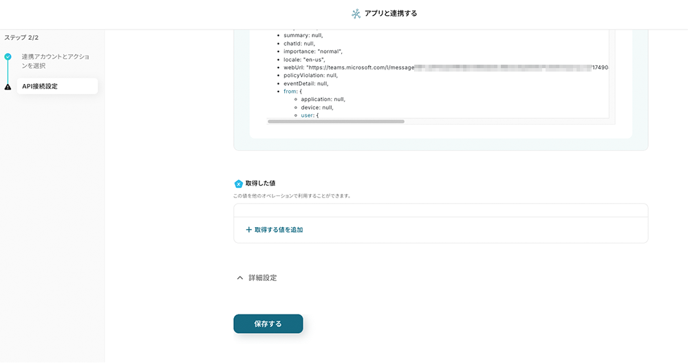 - 編集欄をクリックするとプルダウンが開き、連携したMicrosoft Teamsのスペース名が表示されます。メッセージを送るスペースを選択するとIDが取得されます。