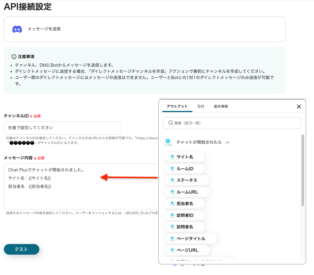 Webhookの設定後に、テスト用として新規チャットを開始し、「テスト」をクリックしてください。