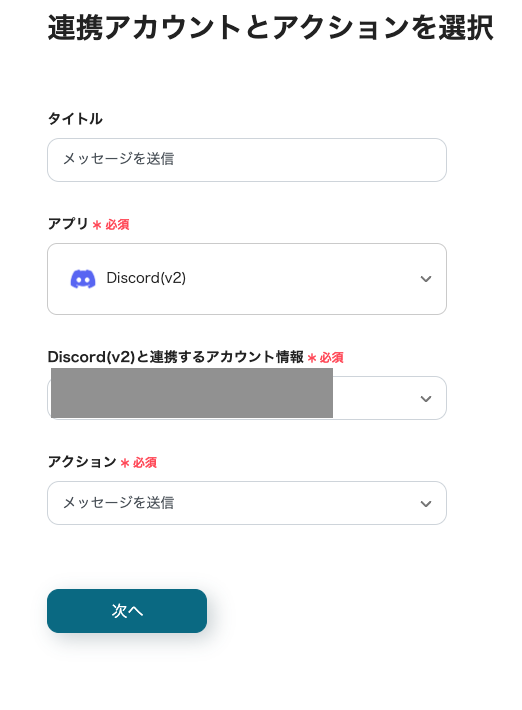 タイトルの任意編集とアカウント情報の確認を行い、「次へ」をクリックしてください。