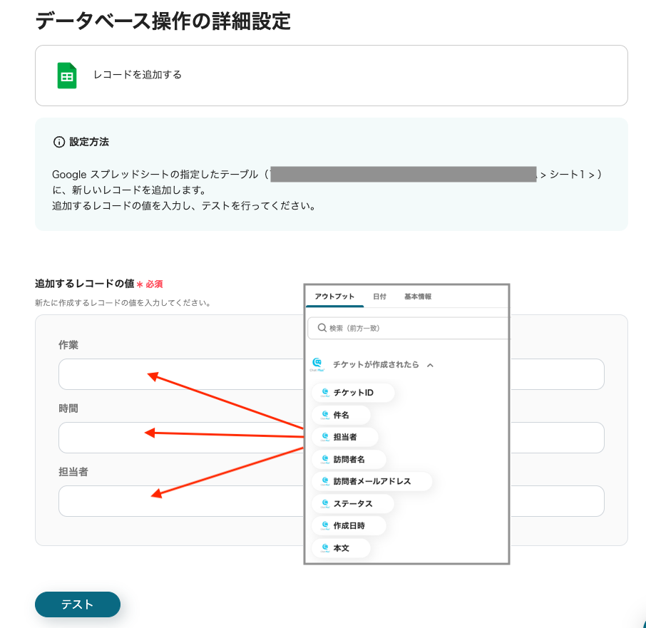 設定後「テスト」をクリックし、Google スプレッドシートに情報が追加されたことを確認しましょう。