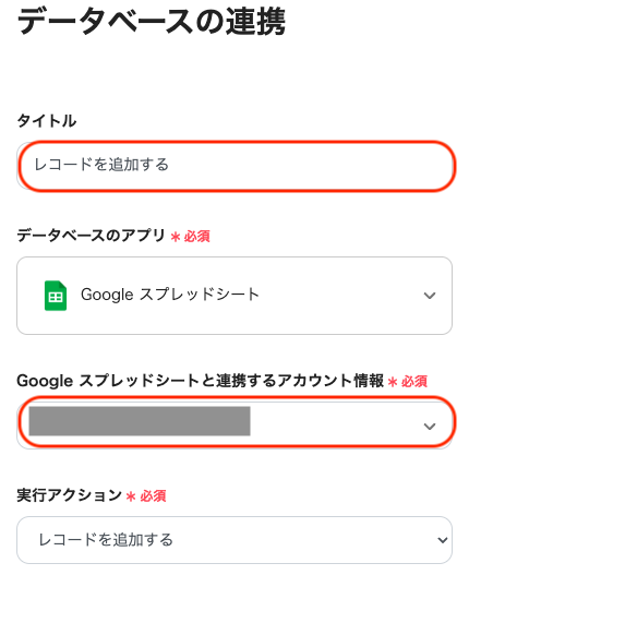 ここでは先ほどと同様、タイトルを任意で編集し、アカウント情報を確認した後、アクションを変更せずに「次へ」をクリックします。