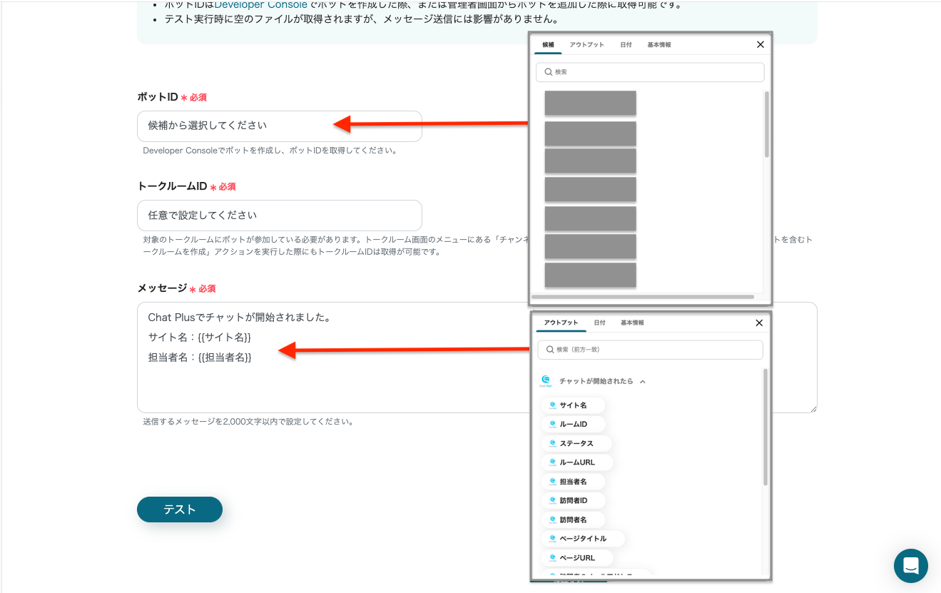 設定後に「テスト」をクリックして、指定したトークルームにメッセージが送信されるか確認しましょう。