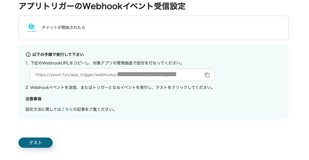 Webhookの設定後、テスト用に新規チャットを開始し、「テスト」をクリックしてください。