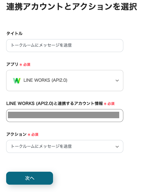 続いて、LINE WORKSのアクションを設定します。