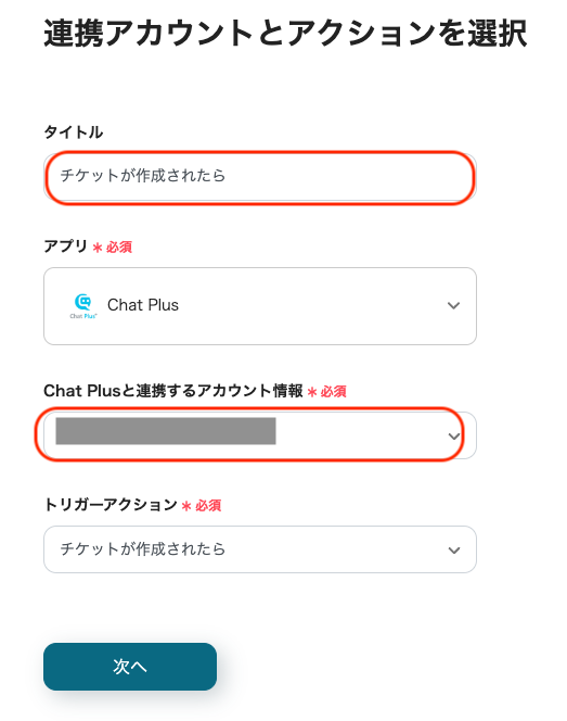 「タイトル」は任意で編集可能ですが、「トリガーアクション」は変更せず、「次へ」をクリックしてください。