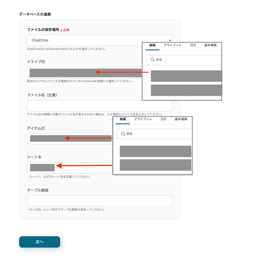 同じく「アイテムID」と「シート名」も候補から選択してください。