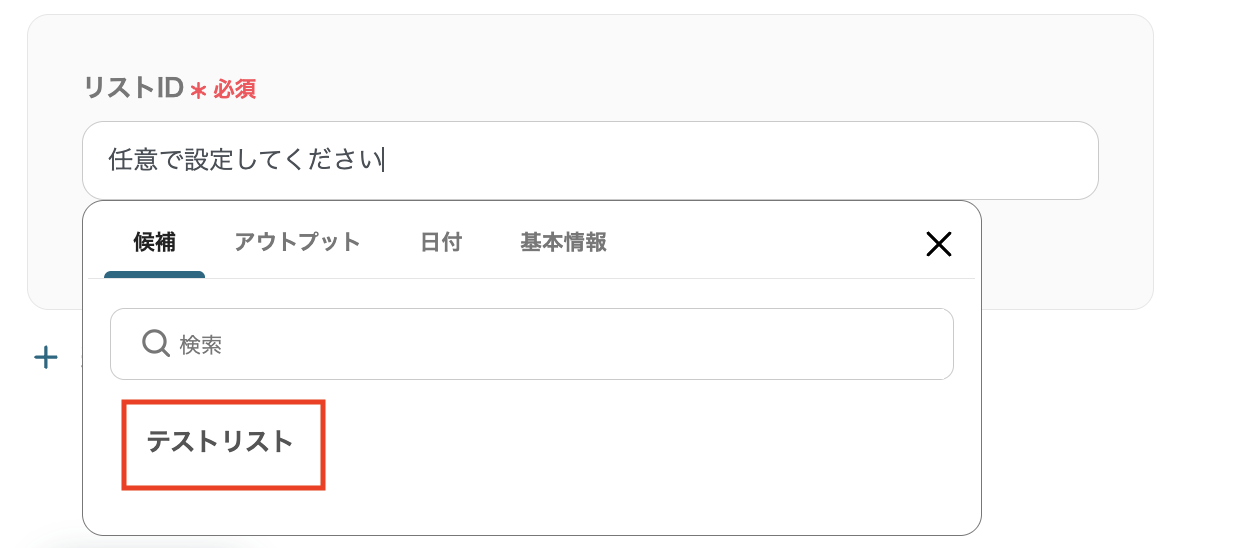 リストIDは、「リストID」欄をクリックすると表示される候補から選択してください。