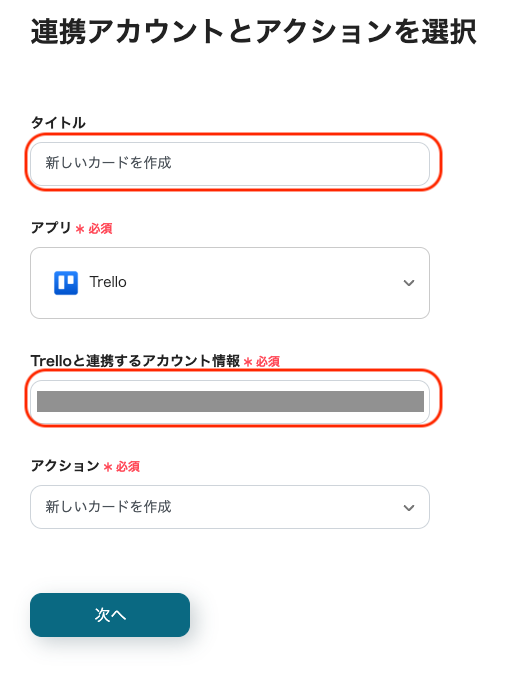 「タイトル」は任意で編集できますが、「トリガーアクション」は変更せず、「次へ」をクリックしてください。
