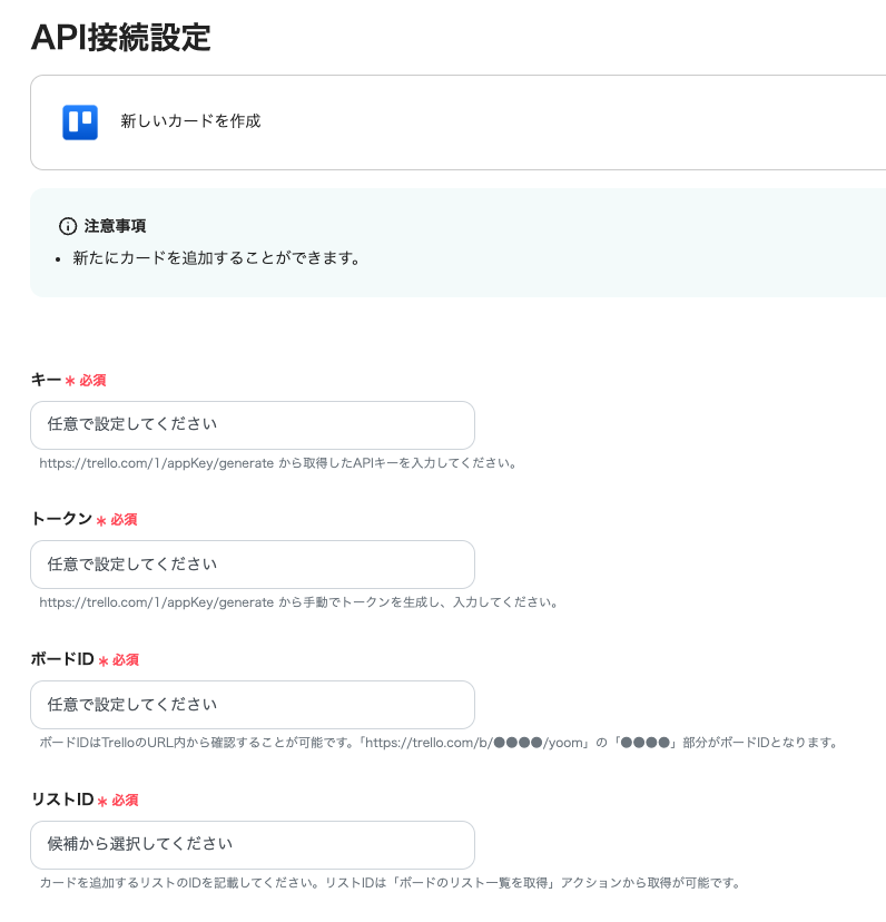 「※ 必須」が記載されている項目は、注釈を参考にしながらTrelloで取得した必要な情報を入力します。