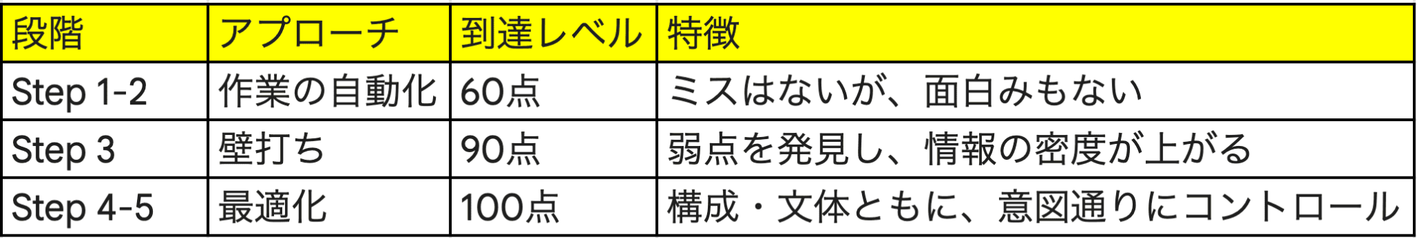 今回の検証で、最もクオリティが上がったのは、ダメ出しをさせたStep 3でした。AIに一度ブレーキをかけ、客観的な視点を持たせる一手間こそが、AIを単なるツールからパートナーに変える、壁打ちの真髄といえます。
