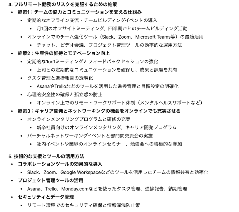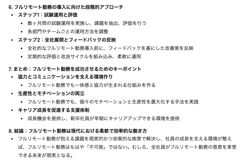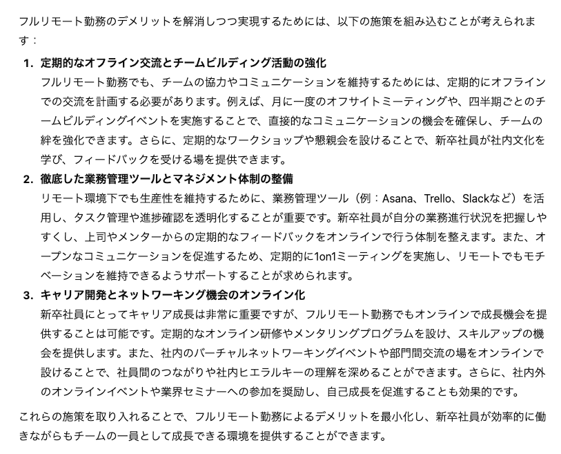 では、これらのデメリットを解消しつつフルリモートを実現するための具体的な解決策(施策)を、私の主張に組み込むとしたらどうなりますか?