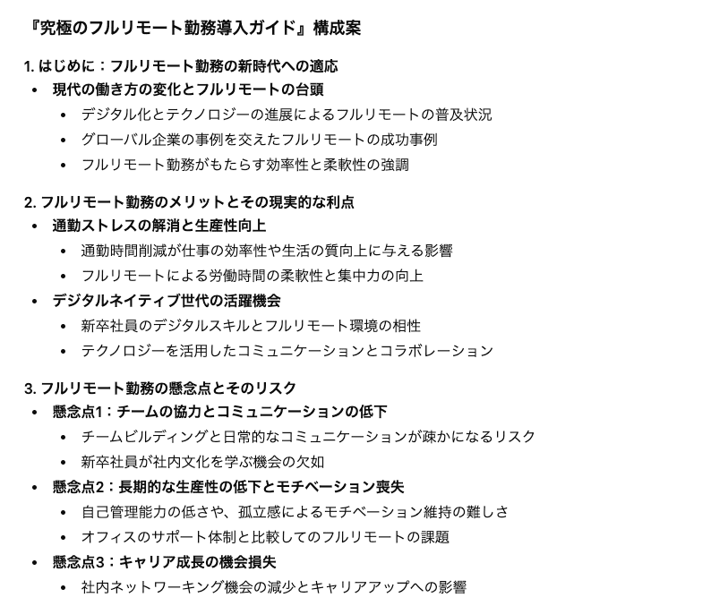 今までの議論を踏まえ、フルリモートのメリットを活かしつつ、懸念点を完全にカバーした『フルリモート勤務導入ガイド』の構成案を作成してください。反対派も納得せざるを得ないような、現実的かつ強固な論理構成にしてください。