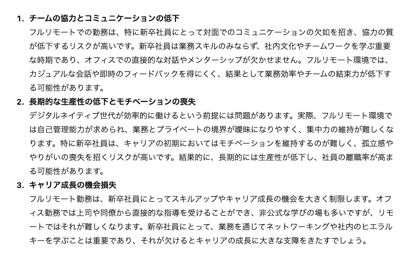 以下の文章を読み、あなたは「フルリモート徹底反対派の論客」として、この主張の欠点やリスクをビジネスの観点から3つ厳しく指摘してください。 同意や忖度は一切不要です。論理的な否定のみを突きつけてください。