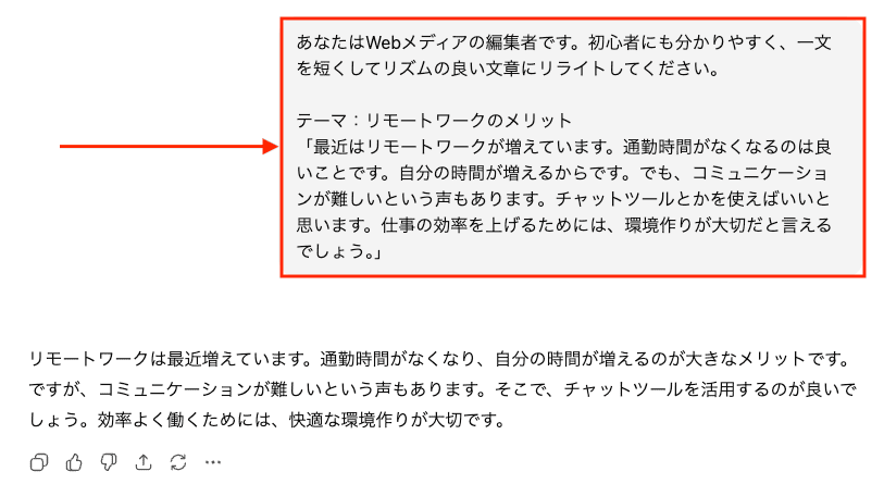 「プロのコピーライターとして」「小学生にもわかるように」など、誰の視点で答えてほしいかを明確に指定することで、回答の精度と納得感が変わります。