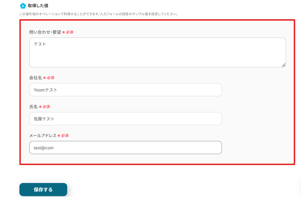 「取得した値」に、入力フォームの回答サンプルを設定します。こちらはアウトプットとして、この後のフローの設定時に活用します。