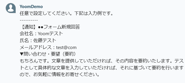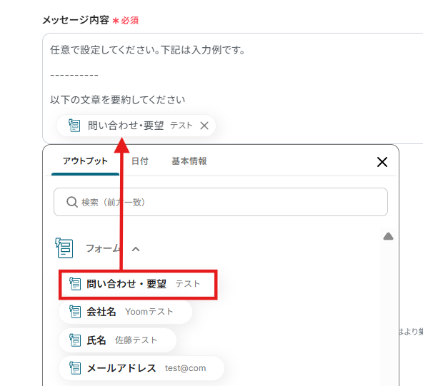 今回は、「以下の文章を要約してください」を定型文として固定値で設定し、「問い合わせ・要望」をアウトプットを用いて設定してみました!