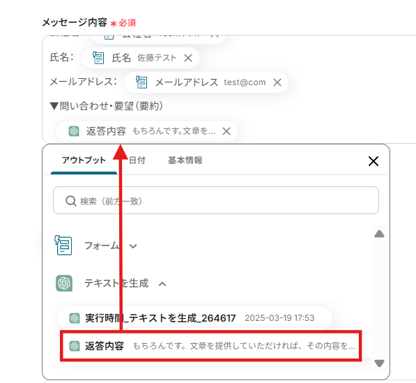 「メッセージ内容」には、ChatGPTでテキストを自動生成する際のプロンプトを設定します。先ほど回答フォームで取得したアウトプットを引用することができます。