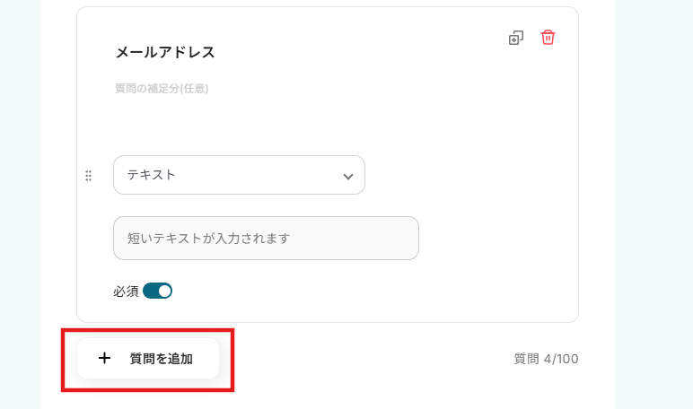 「質問を追加」から質問事項を増やすことができます。用途に合わせて項目を設定後、「次へ」をクリックしましょう。
