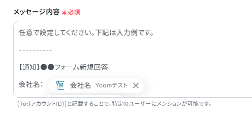 フォームの回答情報を用いたい値はアウトプットを活用し、毎回同じテキストを使用するテキストは固定値で入力しましょう。