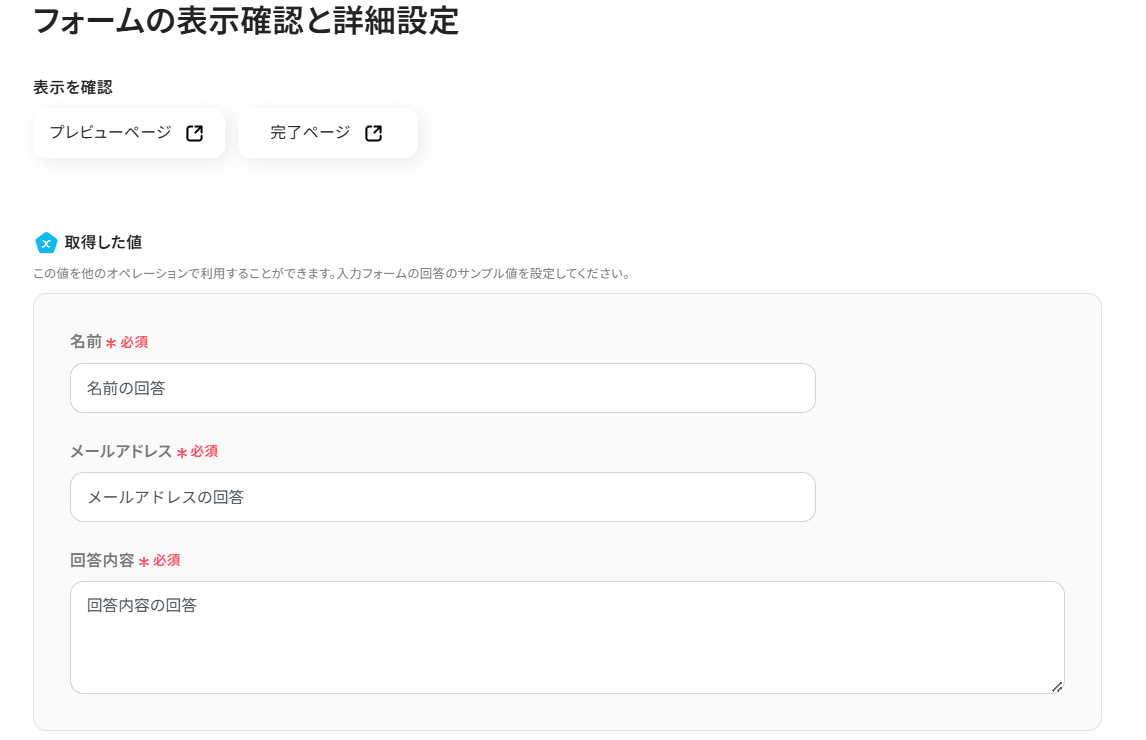 「取得した値」の部分には、通常フォームの回答が反映されますがフローを動かす前なので今回のテスト用にご自身で入力をしてください!