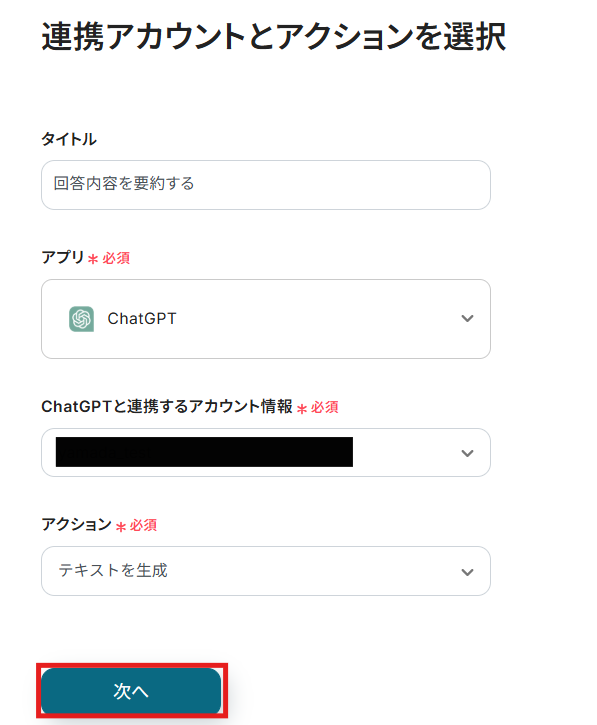 2) アクションは「回答内容を要約する」を選択して、「次へ」をクリックします。