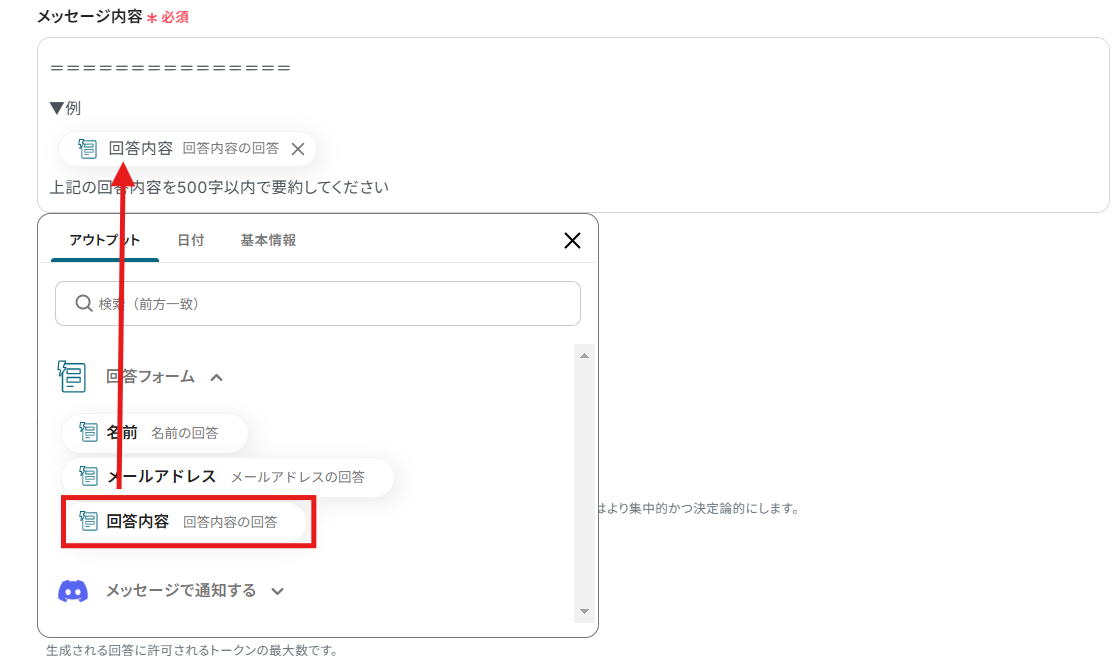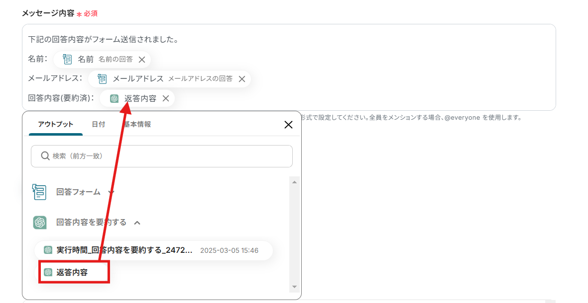 メッセージ内容は回答フォームのアウトプットを選択することができます。