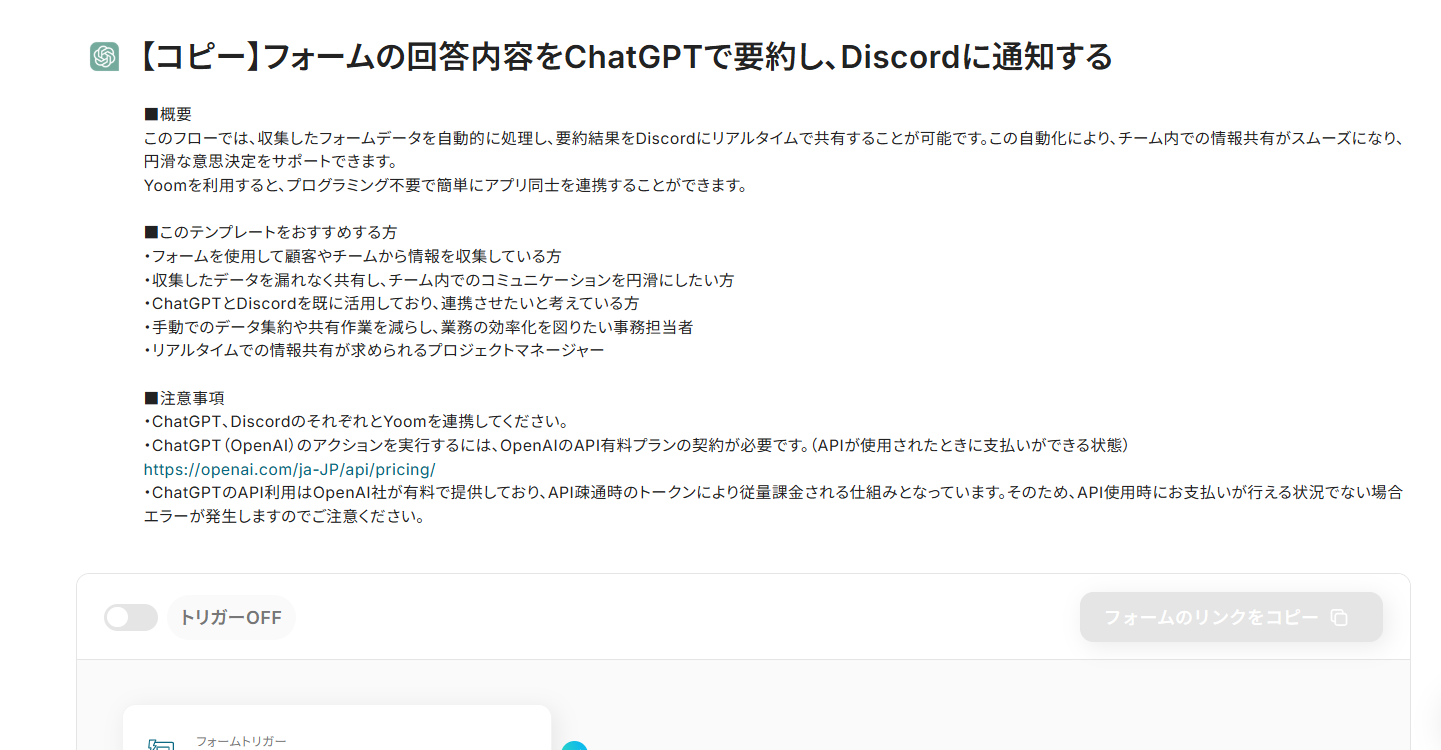 YoomにはあらかじめChatGPT とDiscordを連携するためのテンプレートが用意されているため、APIの知識が無くても、登録するだけで今すぐ連携が実現できます。