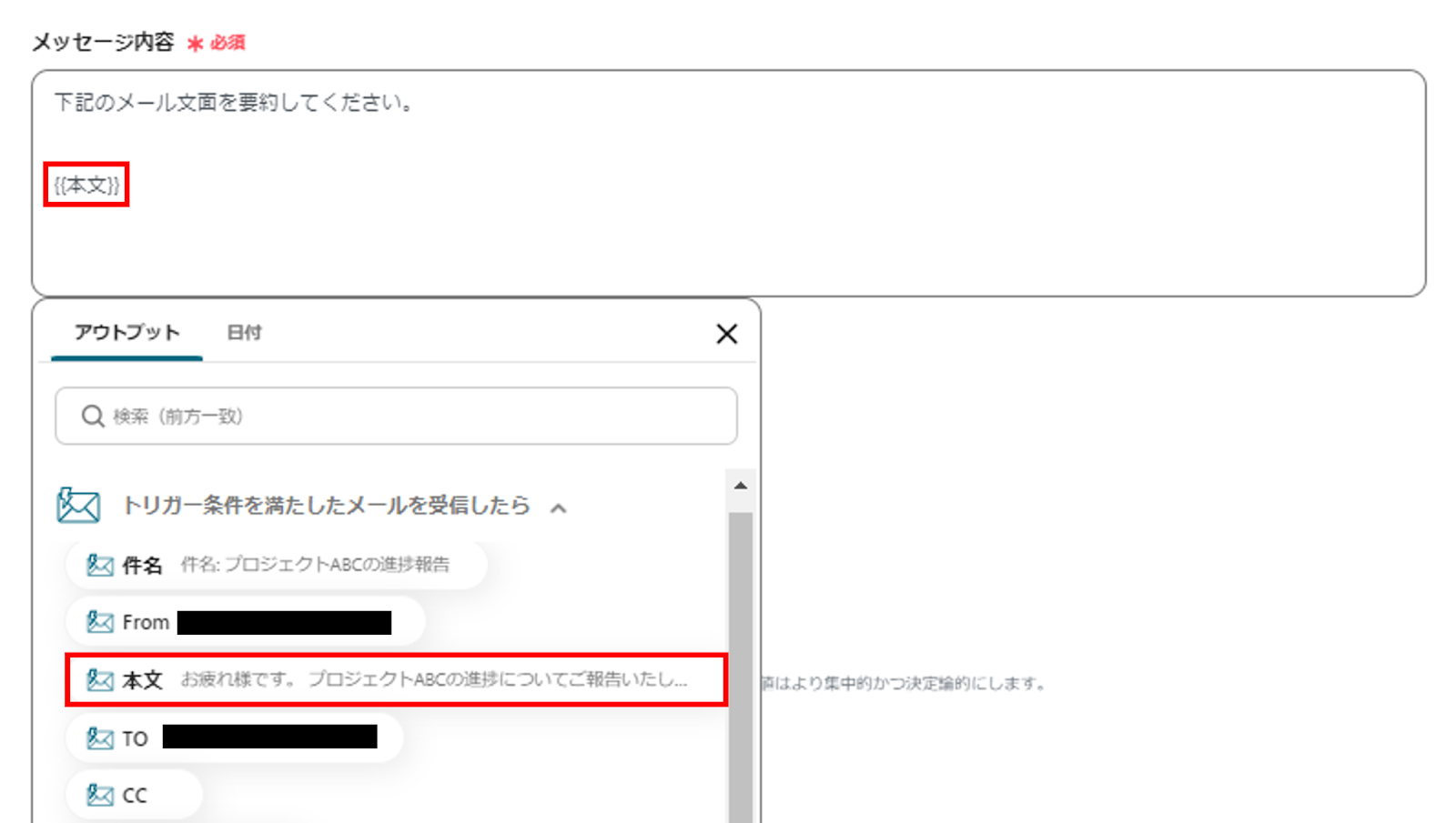 一つ前のオペレーションで設定したChatGPTの情報をアウトプットで利用できることです。
