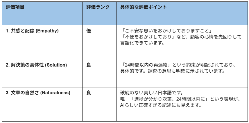 具体的には、提示した制約条件を網羅しつつ、人間による修正を最小限に抑えた「実業務の下書き」として通用する即戦力性(業務代替性)を評価します。あわせて、適切な謝罪と次のアクションの提示により、遅延というマイナス事象を誠実な対応というプラスの印象へ転換し、ブランドの信頼回復に寄与する「プロフェッショナルな誠実さ」の再現性を確認することを目指します。