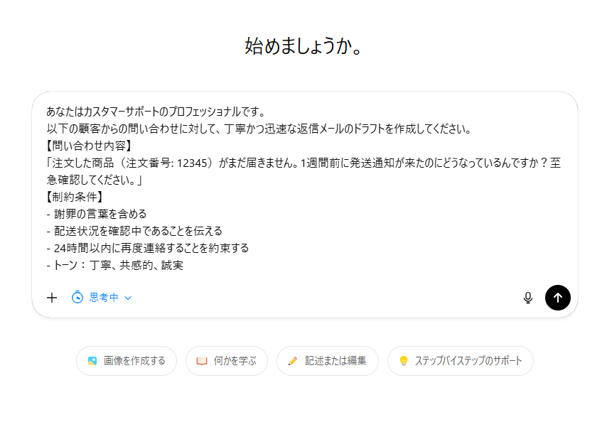 複雑な状況を論理的に分析(思考)するプロセスを挟むことで、顧客の不満の本質を捉えた、より思慮深く共感的な回答を導き出せます。
