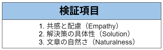 以下に、3つの評価基準に基づいた検証結果をまとめました。
