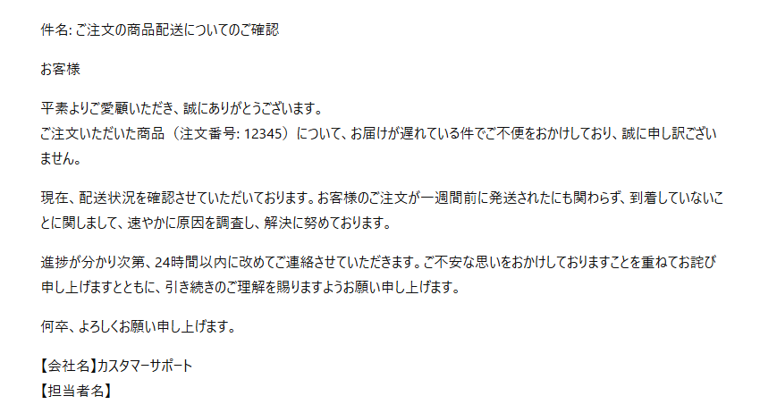 「注文した商品(注文番号: 12345)がまだ届きません。1週間前に発送通知が来たのにどうなっているんですか?至急確認してください。」